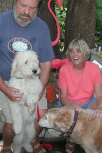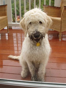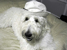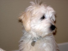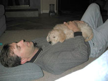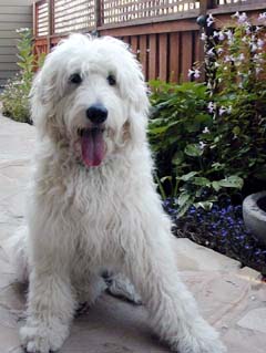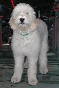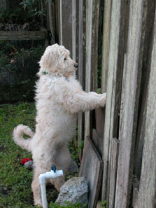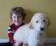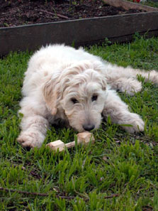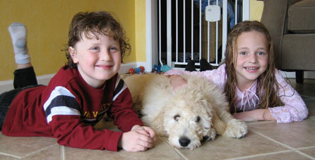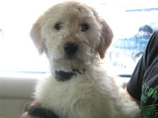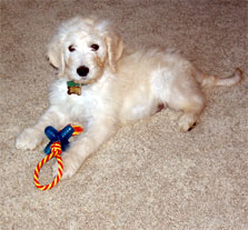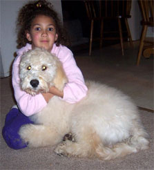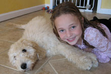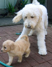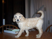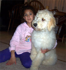 Goldendoodle, 8 months old, daughter of Jacques and Gracie. Maggie is happy with her new family and loves her new companion!