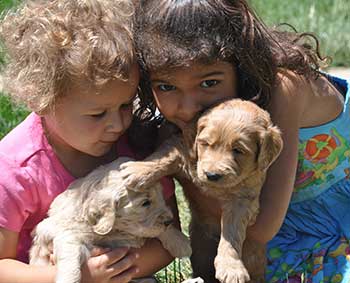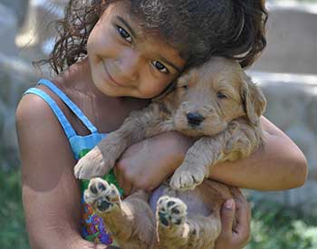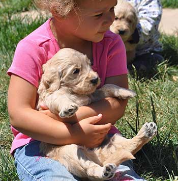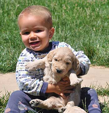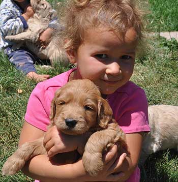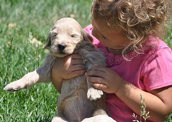 Our Goldendoodles have big boxy faces with short noses and a shorter, heavier boned body more like the Golden Retriever.  We feel that this body type is more complimentary to the Goldendoodle than the long elegant leggy look of the Poodle.  Even more important than gorgeous looks, our Goldendoodles have a Teddy Bear disposition.  They are raised for their extreme intelligence, willingness to please, gentleness and sweet outgoing dispositions in order to be the perfect fit for homes with young children.  They are also very adaptable and intuitive which allows them to be wonderful companions for a large range of different types of families, as long as love is included!