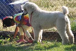 Nicholas is an AKC Registered white Standard Poodle. Most people that see him think he's a mini. Nicholas was born and raised here with us. We bred Gwen, our very small standard Poodle with Ivan, our mini Poodle in hopes of keeping back a pick of litter male that would be larger than a mini but smaller than a normal standard, and that's what we got with Nicholas! We use him for the smallest of the teddy bear Goldendoodles that we breed. His puppies generally range in size from 30-55 pounds. Nicholas is a friendly, sweet boy that loves attention. He stands 15 inches at the shoulder (the cut off for a miniature is 14 inches) and weighs about 30 pounds. He's wonderful with everyone from the youngest children to elderly. He's also good with all other animals. He's an all around good boy, easy going, happy disposition. What a great addition he's been to our breeding program and family.